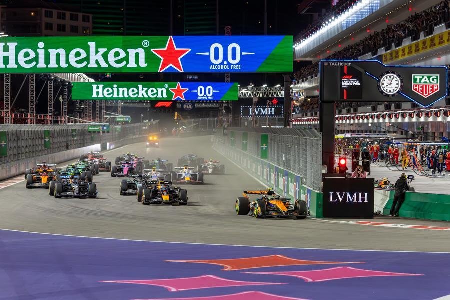 McLaren's Lando Norris (R) leads Red Bull's Max Verstappen (C) and Williams' Carlos Sainz (L) away at the start of the 2025 F1 Las Vegas Grand Prix, Nov. 22, 2025. (Photo by Qian Jun/Xinhua)