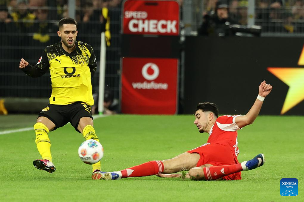 Josip Stanisic (R) of FC Bayern Munich vies with Yan Couto of Borussia Dortmund during the German first division Bundesliga football match between FC Bayern Munich and Borussia Dortmund in Dortmund, Germany, Feb. 28, 2026. (Photo by Joachim Bywaletz/Xinhua)