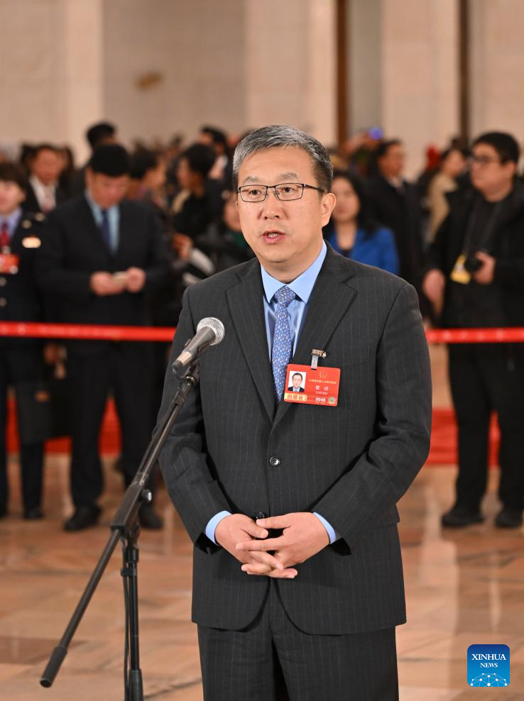 Dong Jin, a deputy to the 14th National People's Congress (NPC), attends a group interview ahead of the opening meeting of the fourth session of the 14th NPC at the Great Hall of the People in Beijing, capital of China, March 5, 2026. (Xinhua/Li Xin)