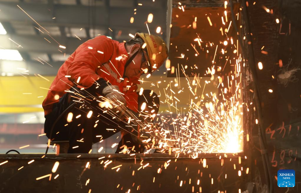 A worker carries out grinding operation at a manufacturing base in Wuhan, central China's Hubei Province, Feb. 25, 2026. [Photo/Xinhua]