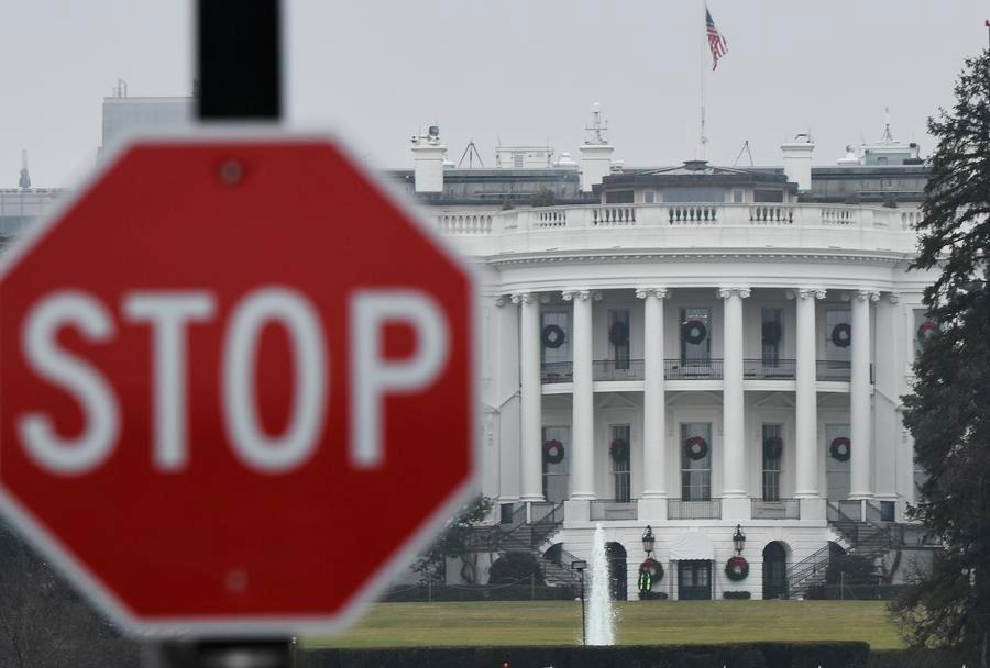 Photo taken on Dec. 28, 2018 shows the White House and a stop sign in Washington D.C., the United States. [Photo/Xinhua]