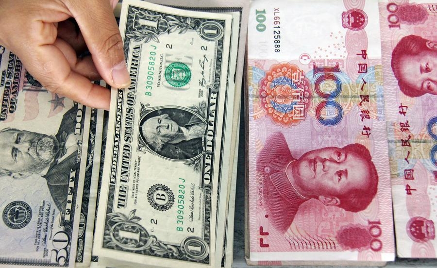 File photo shows a teller picks a dollar bill among banknotes of U.S. dollar and Renminbi (RMB) at a bank in Linyi, east China's Shandong province. [Photo/Xinhua]