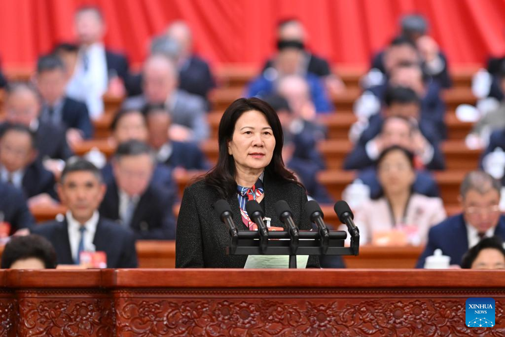 Huo Jinhua, a member of the 14th National Committee of the Chinese People's Political Consultative Conference (CPPCC), speaks at the second plenary meeting of the fourth session of the 14th CPPCC National Committee at the Great Hall of the People in Beijing, capital of China, March 7, 2026. (Xinhua/Liu Weibing)