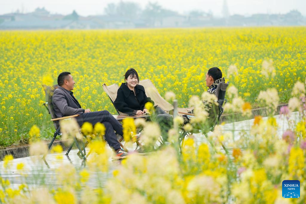Tourists enjoy leisure time among blooming flowers at Pengshan District of Meishan, southwest China's Sichuan province, March 7, 2026. (Photo by Weng Guangjian/Xinhua)