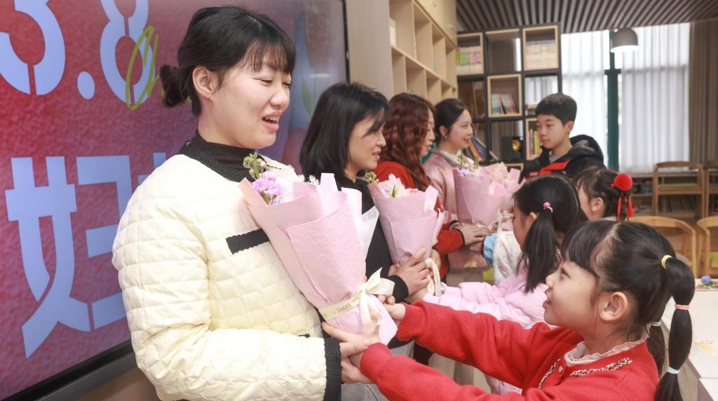 Students present flowers to their mothers during an event in celebration of the International Women's Day at a primary school in Hongshan District of Wuhan, central China's Hubei province, March 8, 2026. Various events were held across China on Sunday to mark the International Women's Day. (Photo by Zhao Jun/Xinhua)