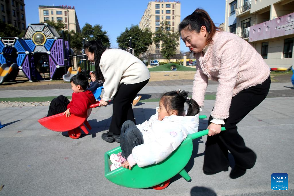 Children and their mothers attend a fun sports game at a kindergarten in Lianyungang City, east China's Jiangsu province, March 8, 2026. Various events were held across China on Sunday to mark the International Women's Day. (Photo by Wang Chun/Xinhua)