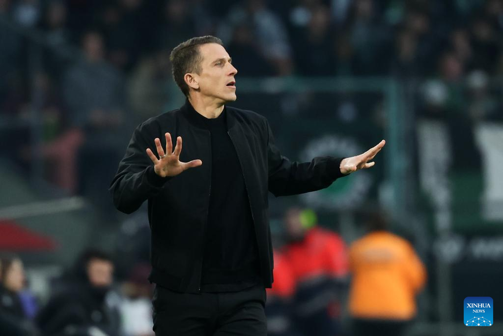 Head coach of VfL Wolfsburg Daniel Bauer gestures during the German first division of Bundesliga football match between Borussia Moenchengladbach and VfL Wolfsburg in Moenchengladbach, Germany, Dec. 13, 2025. (Photo by Joachim Bywaletz/Xinhua)