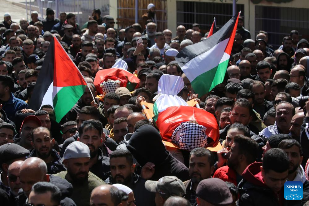 Palestinians attend the funeral of three Palestinians in the village of Khirbet Abu Falah, north of Ramallah in the West Bank, on March 8, 2026. [Photo/Xinhua]