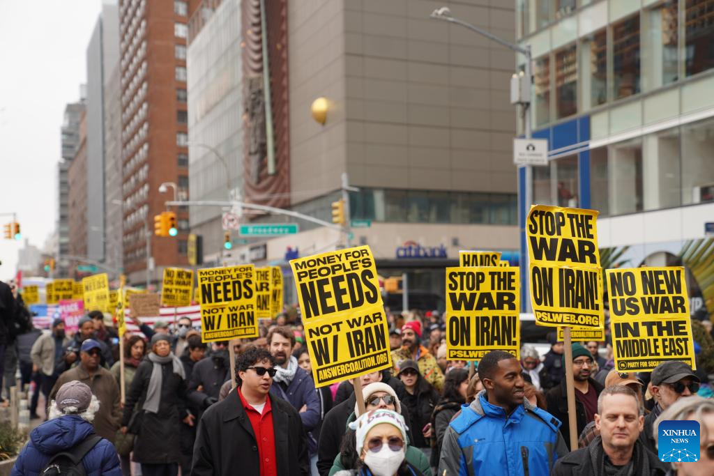People attend a rally against U.S.-Israeli attacks on Iran, in New York, the United States, March 7, 2026. [Photo/Xinhua]
