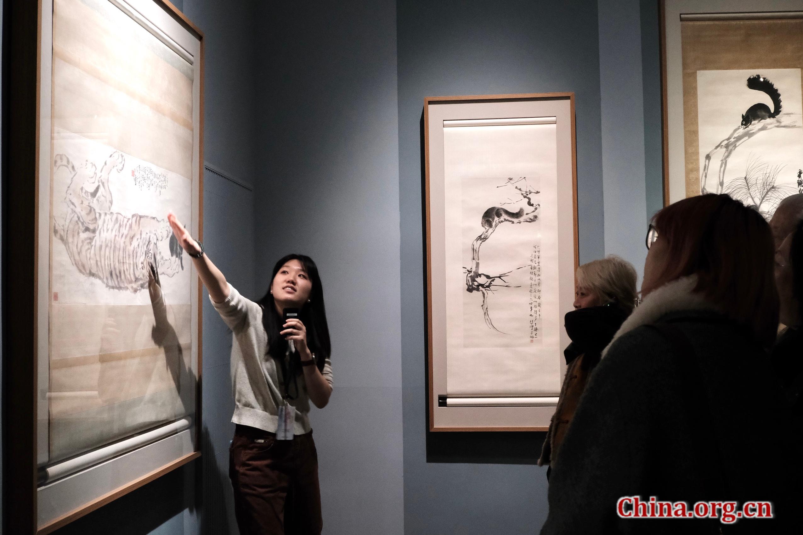 Visitors listen to a staff member explaining artworks at the Guardian Art Center, Beijing, March 7, 2026. [Photo by Liao Jiaxin/China.org.cn]