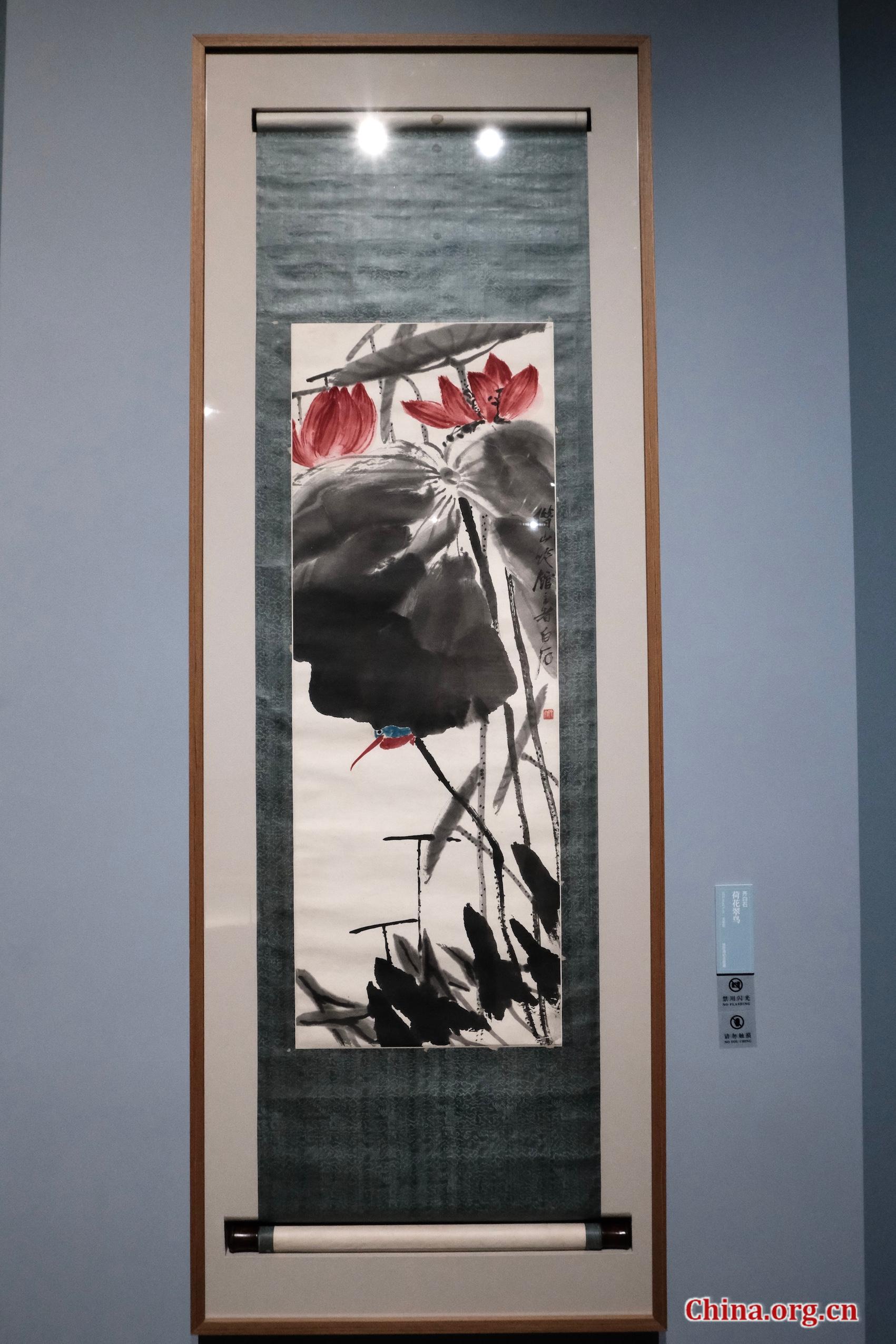 A lotus and kingfisher painting by Qi Baishi on display at the Guardian Art Center, Beijing, March 7, 2026. [Photo by Liao Jiaxin/China.org.cn]