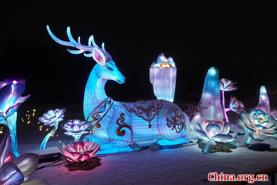 A lantern of a giant deer is covered in snow at the Lantern Fair in Yuanmingyuan, Mar. 4, 2026. [Photo by Li Congrong/China.org.cn]