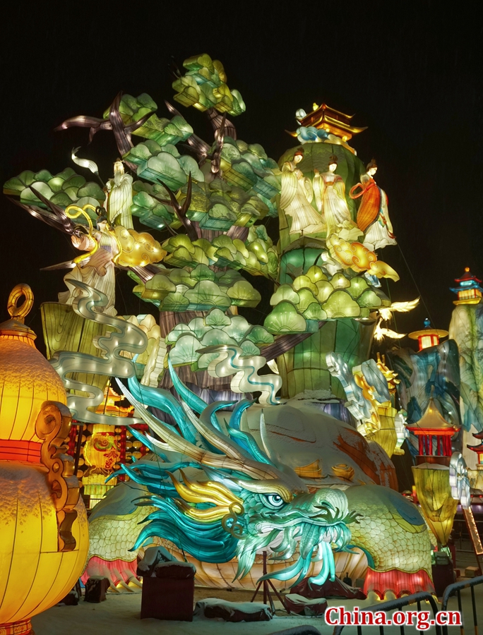 A lantern artwork derived from a myth of a giant turtle bearing a sacred mountain at the Lantern Fair in Yuanmingyuan, Mar. 4, 2026. [Photo by Li Congrong/China.org.cn]