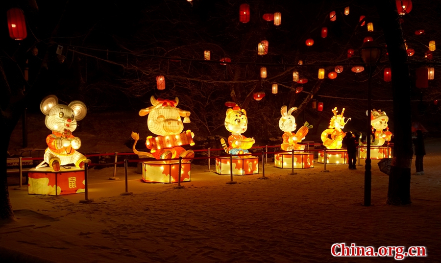 Lanterns of 6 Chinese zodiac signs' cartoon figures at the Lantern Fair in Yuanmingyuan, Mar. 4, 2026. [Photo by Li Congrong/China.org.cn]