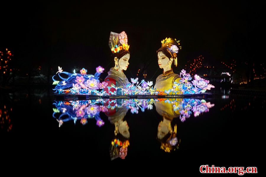 An 8-meter-tall lantern of two courtly ladies at the Lantern Fair in Yuanmingyuan, Mar. 4, 2026. [Photo by Li Congrong/China.org.cn]
