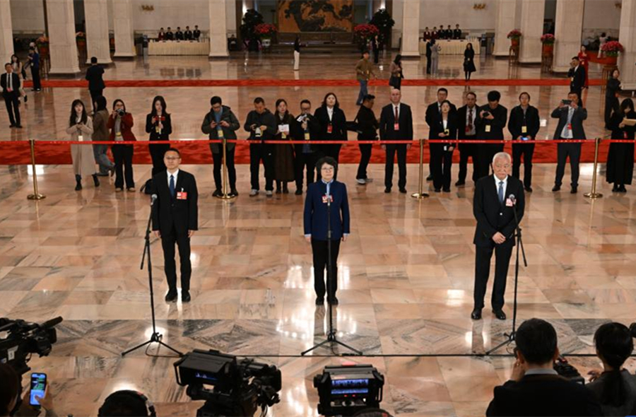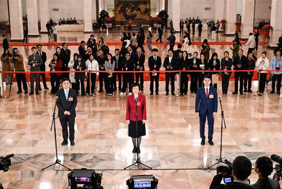 Members of the 14th National Committee of the Chinese People's Political Consultative Conference (CPPCC) attend a group interview ahead of the second plenary meeting of the fourth session of the 14th CPPCC National Committee at the Great Hall of the People in Beijing, March 7, 2026. [Photo/Xinhua]