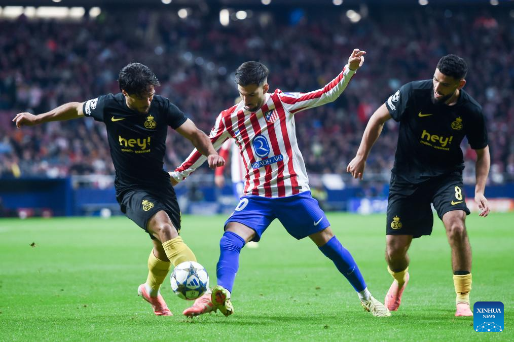 Alejandro Baena (C) of Atletico de Madrid vies with Kevin Marc Allister (C) Union Saint-Gilloise during the UEFA Champions League football match between Atletico de Madrid and Union Saint-Gilloise in Madrid, Spain, on Nov. 4, 2025. (Photo by Gustavo Valiente/Xinhua)