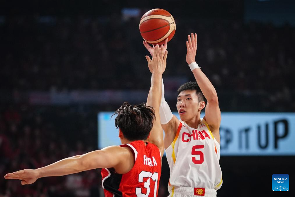 Liao Sanning (R) of China shoots during the Group B match between China and Japan at the FIBA Basketball World Cup Asian Qualifiers in Okinawa, Japan, Feb. 26, 2026. (Xinhua/Jia Haocheng)