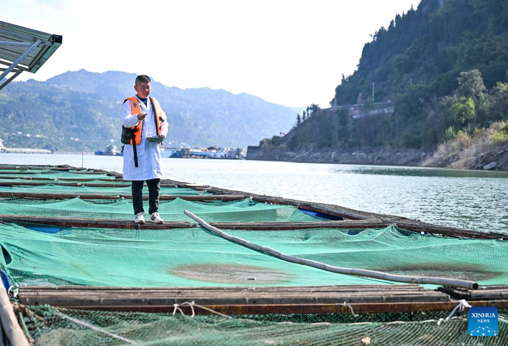 A staff member feeds the fish at the Dazhou base of the fisheries research institute of Wanzhou District, southwest China's Chongqing, March 9, 2026. (Xinhua/Wang Quanchao)