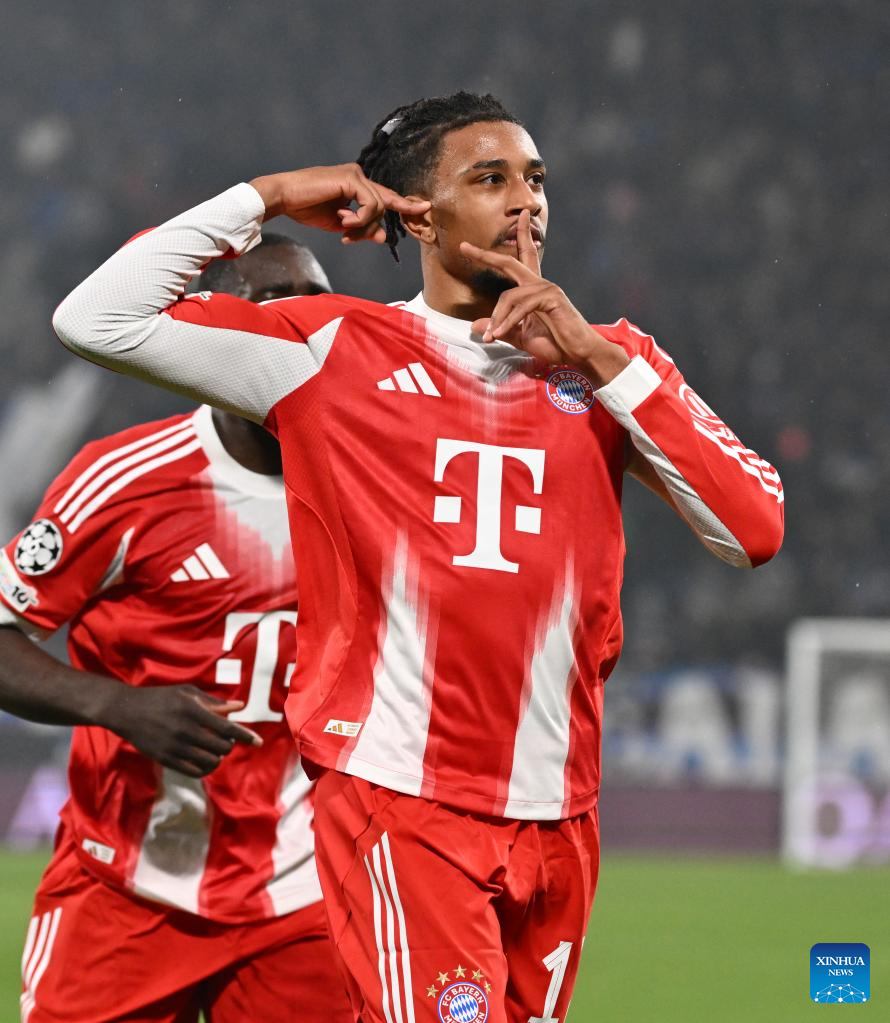 Bayern Munich's Michael Olise celebrates his goal during the UEFA Champions League Round of 16 first leg match between Atalanta and Bayern Munich in Bergamo, Italy, March 10, 2026. (Photo by Alberto Lingria/Xinhua)
