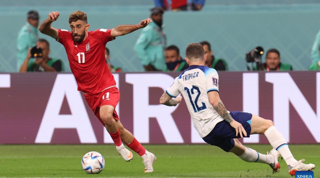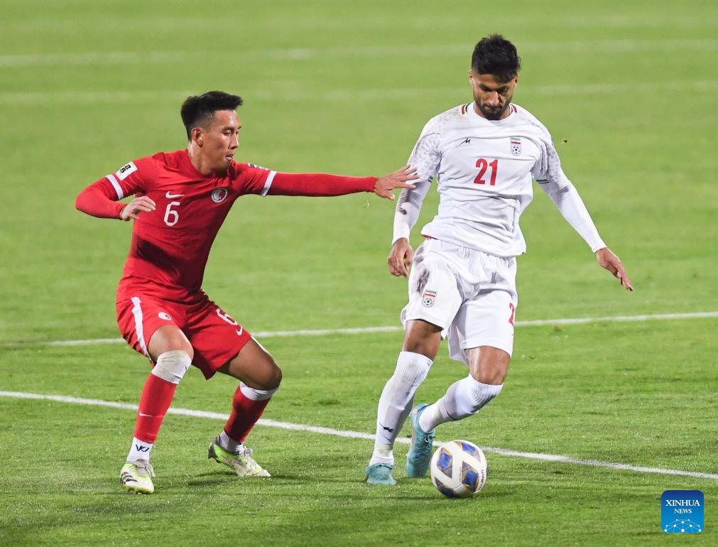 Mohammad Mohebbi (R) of Iran competes during the group E match between Chinese Hong Kong and Iran at the 2026 FIFA World Cup qualifier in Tehran, Iran, on Nov. 16, 2023. (Xinhua/Shadati)