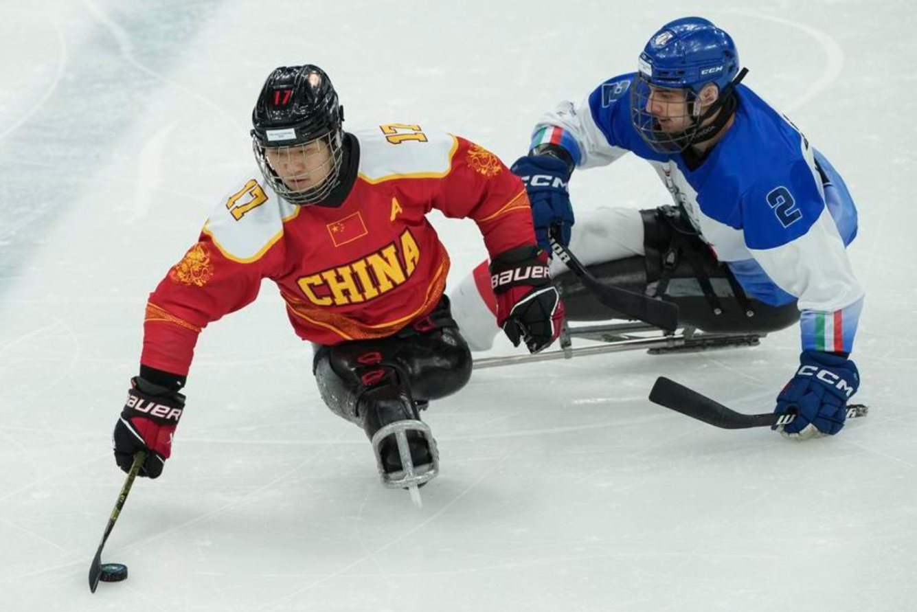 Shen (L) in action against Italy at the 2026 Paralympic Winter Games, March 9, 2026. (Xinhua/Hou Jun)