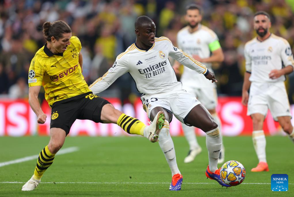 Ferland Mendy of Real Madrid (front R) vies with Marcel Sabitzer (front L) of Borussia Dortmund during the UEFA Champions League final match between Real Madrid and Borussia Dortmund in London, Britain, June 1, 2024. (Xinhua/Str)