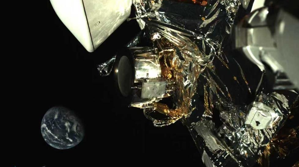 This image released by the China National Space Administration (CNSA) on Oct. 1, 2025 shows a view of the Tianwen-2 probe alongside Earth, captured by the probe during its deep-space journey. [Photo/CNSA handout via Xinhua]