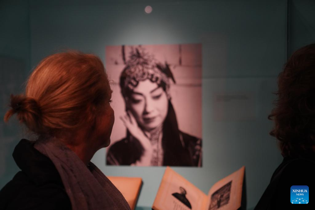 People visit an exhibition titled "The Dancing Goddess: Mei Lanfang in America" in New York, the United States, on March 11, 2026. The exhibition, featuring stage costumes, photographs, performance videos, original production props, and artwork of China's renowned Peking Opera artist Mei Lanfang, opened here on Wednesday to mark the 96th anniversary of his 1930 North American tour. (Xinhua/Zhang Fengguo)