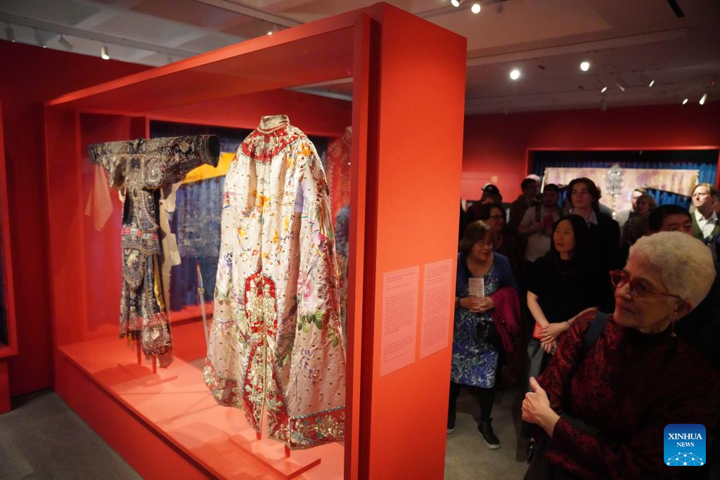 People visit an exhibition titled "The Dancing Goddess: Mei Lanfang in America" in New York, the United States, on March 11, 2026. The exhibition, featuring stage costumes, photographs, performance videos, original production props, and artwork of China's renowned Peking Opera artist Mei Lanfang, opened here on Wednesday to mark the 96th anniversary of his 1930 North American tour. (Xinhua/Zhang Fengguo)