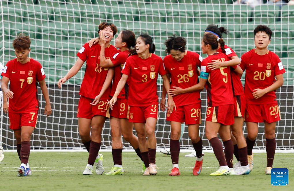 Players of China celebrate scoring during the quarterfinal of Women's Asian Cup between China and Chinese Taipei at Perth Rectangular Stadium in Perth, Australia, March 14, 2026. (Xinhua/Ma Ping)