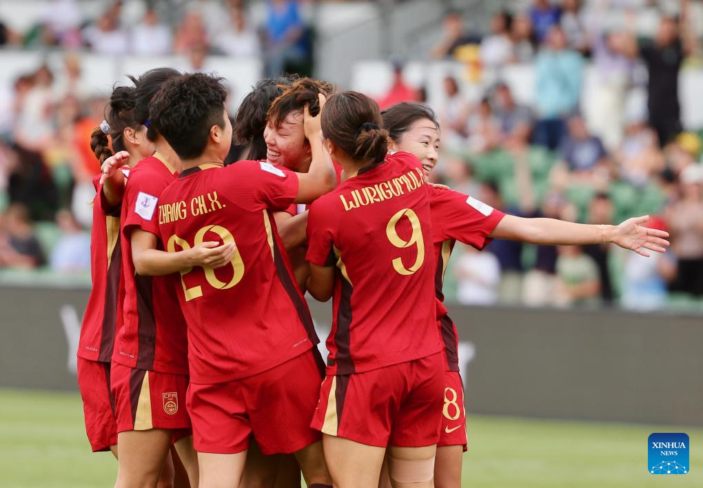 Players of China celebrate scoring during the quarterfinal of Women's Asian Cup between China and Chinese Taipei at Perth Rectangular Stadium in Perth, Australia, March 14, 2026. (Photo by Zhou Dan/Xinhua)