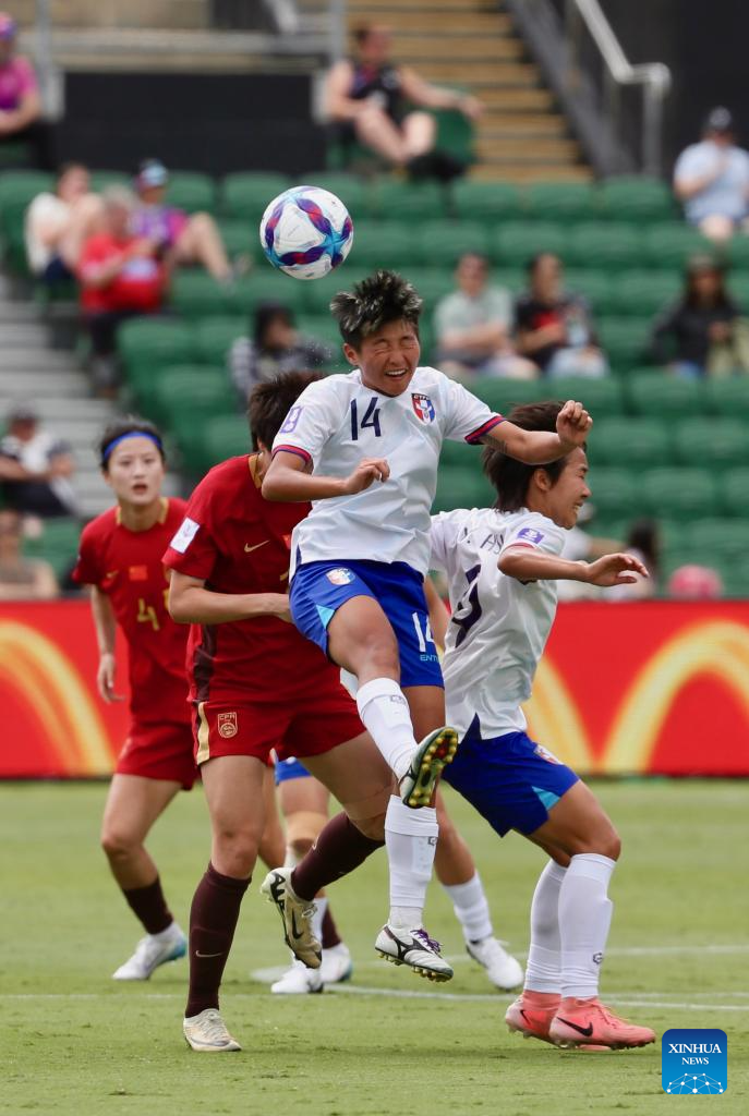 Wu Kai-ching (top) of Chinese Taipei vies for a header during the quarterfinal of Women's Asian Cup between China and Chinese Taipei at Perth Rectangular Stadium in Perth, Australia, March 14, 2026. (Photo by Zhou Dan/Xinhua)