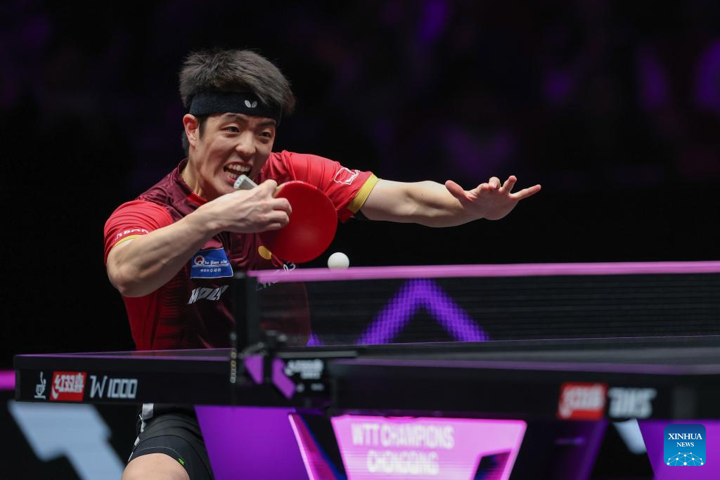 Qiu Dang of Germany hits a return during the men's singles quarterfinal match between Wen Ruibo of China and Qiu Dang of Germany at the WTT Champions Chongqing 2026 in southwest China's Chongqing, March 14, 2026. (Xinhua/Huang Wei)
