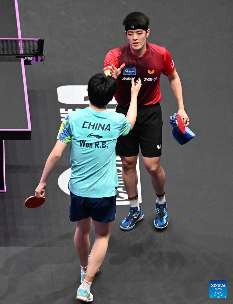 Wen Ruibo (L) of China and Qiu Dang of Germany shake hands after their men's singles quarterfinal match at the WTT Champions Chongqing 2026 in southwest China's Chongqing, March 14, 2026. (Xinhua/Chen Cheng)