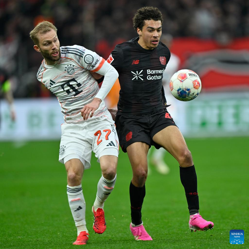 Montrell Culbreath (R) of Bayer 04 Leverkusen vies with Konrad Laimer of Bayern Munich during the German first division Bundesliga football match between Bayer 04 Leverkusen and Bayern Munich in Leverkusen, Germany, March 14, 2026. (Photo by Ulrich Hufnagel/Xinhua)