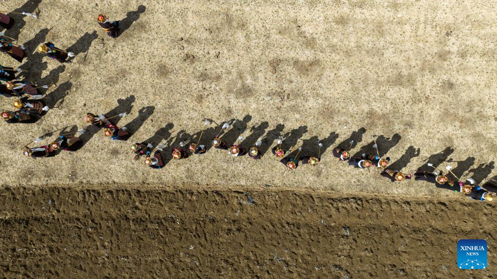An aerial drone photo taken on March 16, 2026 shows villagers participating in a ceremony marking the start of spring farming in Gaiba Village of Shannan City, southwest China's Xizang Autonomous Region. Ceremonies marking the start of spring farming were held across Xizang on Monday. The ceremony holds great significance as it marks the beginning of a new year's farming season and serves as a prayer for favorable weather and bountiful harvests. It is considered an important ritual in the farming regions of Xizang. Over 200 villagers, dressed in traditional attires, participated in the ceremony held in Gaiba Village of Shannan. (Xinhua/Jigme Dorje)