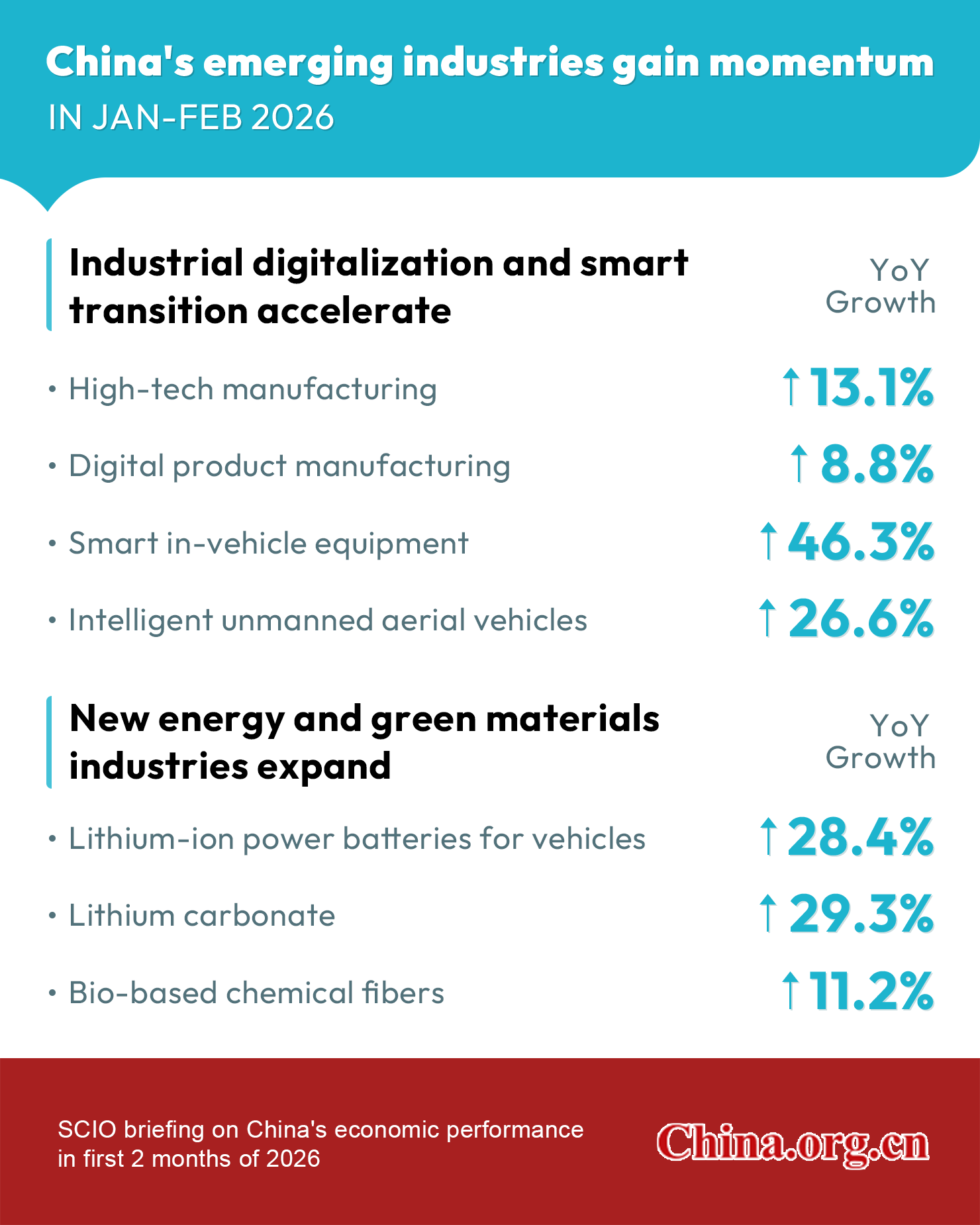 China's emerging industries expanded rapidly in the first two months of 2026, with high-tech manufacturing and smart equipment production recording robust growth as demand for intelligent products continues to rise, an official with the National Bureau of Statistics said at a Monday press conference.