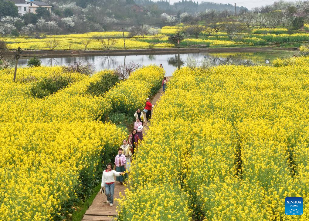 An aerial drone photo taken on March 17, 2026 shows tourists viewing flowers in Xuanzhou Town, Hengshan County of Hengyang City, central China's Hunan province. (Photo by Cao Zhengping/Xinhua)