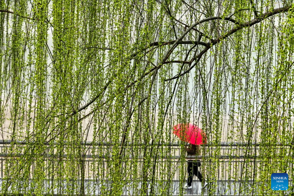 A drone photo taken on March 17, 2026 shows a person enjoying the spring view at a park in Jiyuan City, central China's Henan province. (Photo by Miao Qiunao/Xinhua)
