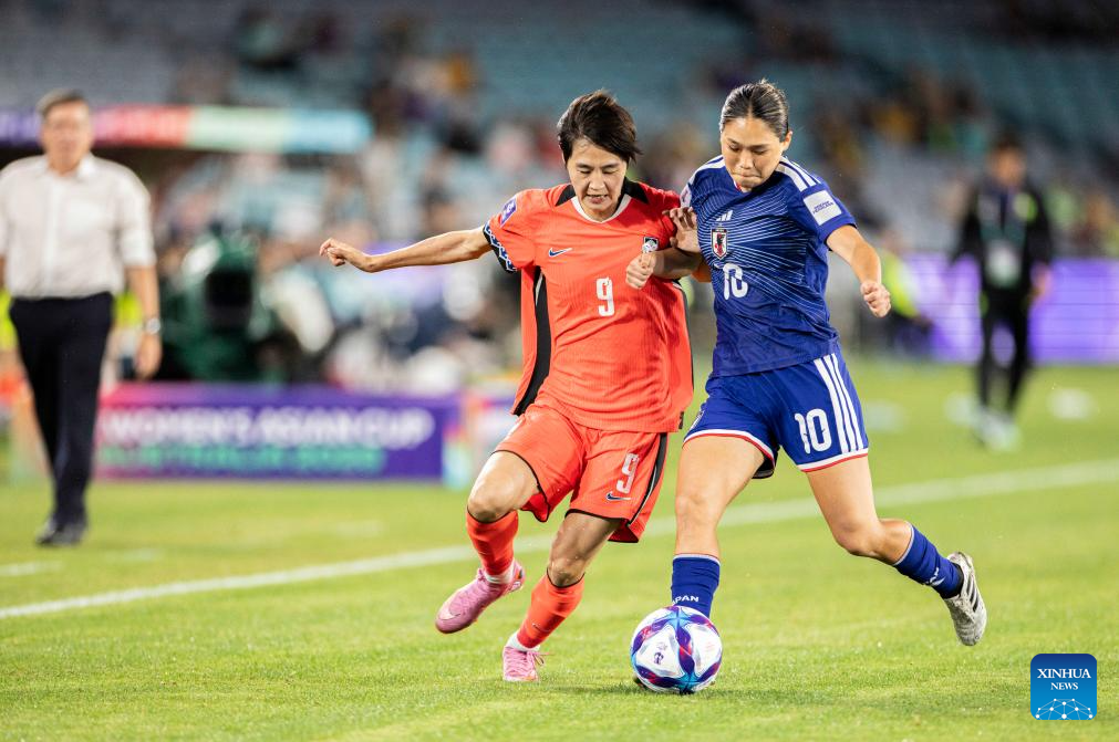 Nagano Fuka (R) of Japan vies with Mun Eunju of South Korea during the semifinal of Women's Asian Cup between Japan and South Korea in Sydney, Australia, March 18, 2026. (Photo by Hu Jingchen/Xinhua)