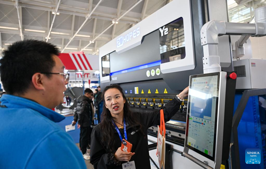 An exhibitor introduces an equipment to a visitor at the 22nd China (Tianjin) International Equipment & Manufacturing Industry Expo (CIEX) in north China's Tianjin, March 18, 2026. (Xinhua/Sun Fanyue)