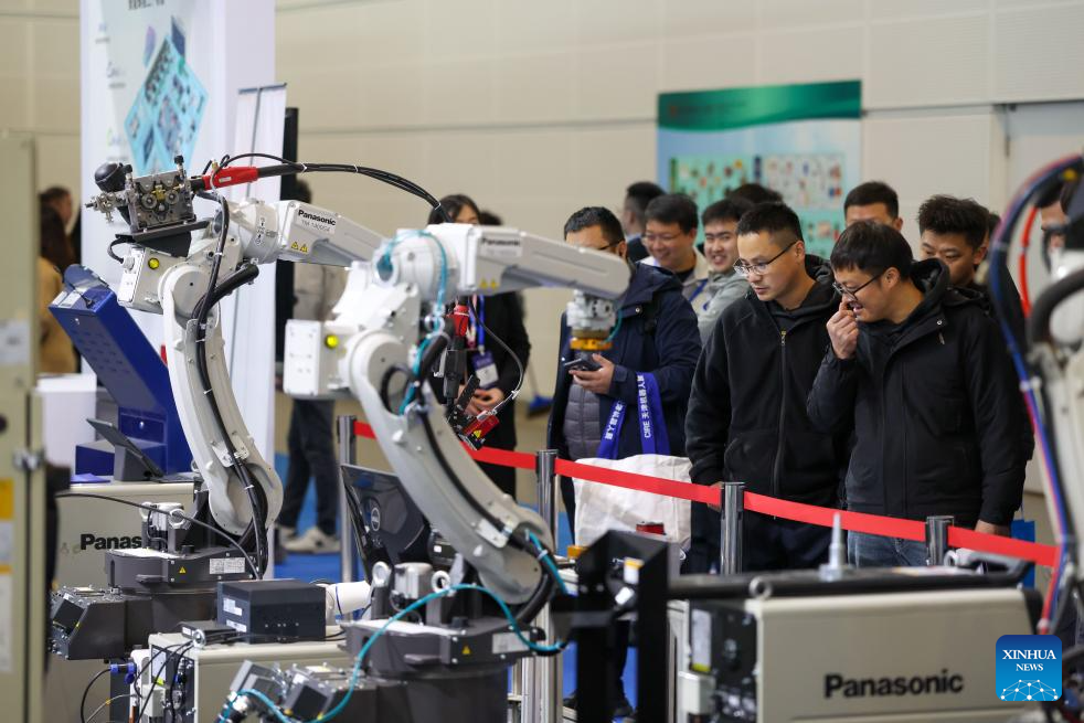 Visitors view industrial robots at the 22nd China (Tianjin) International Equipment & Manufacturing Industry Expo (CIEX) in north China's Tianjin, March 18, 2026. (Xinhua/Sun Fanyue)