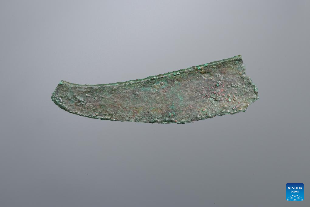 This undated file photo shows a bronze knife dating back to the Western Zhou Dynasty (1046 BC-771 BC), found at the Jiangliu Site in Jingyang County, northwest China's Shaanxi province. [Photo/Shaanxi Academy of Archaeology handout via Xinhua]