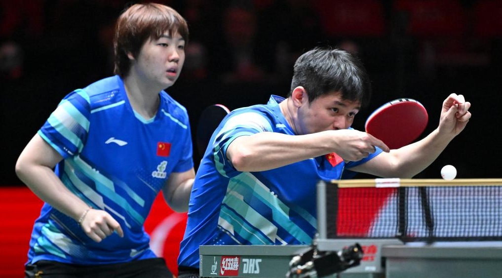 Kuai Man/Lin Shidong (R) of China compete in the mixed doubles match against Sabine Winter/Benedikt Duda of Germany during the stage 2 group match between China and Germany at the ITTF Mixed Team World Cup 2025 in Chengdu, southwest China's Sichuan Province, Dec. 5, 2025. (Xinhua/Xu Bingjie)