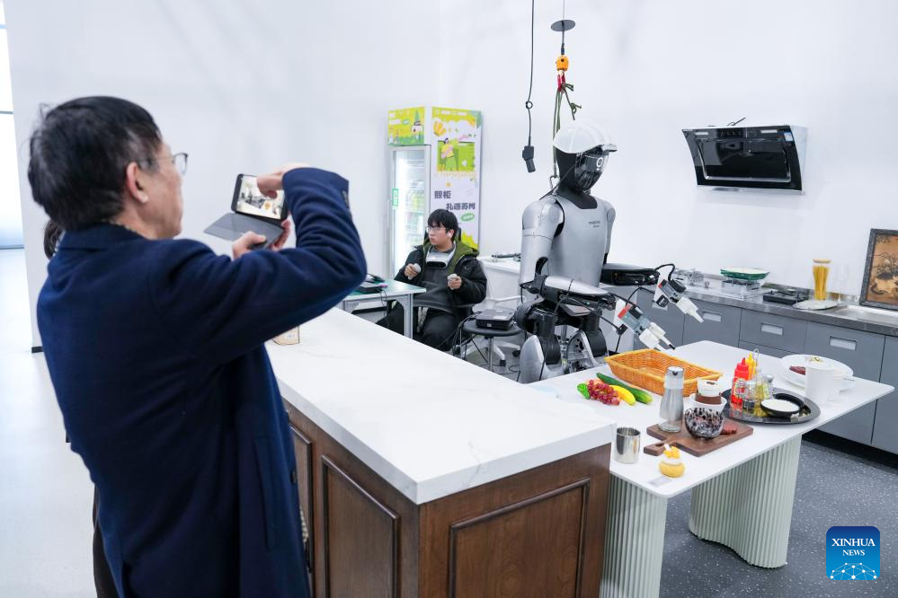 People watch a humanoid robot train in multiple training scenarios at the Suzhou Embodied Artificial Intelligence Robotics Innovation Center in Suzhou, east China's Jiangsu Province, on March 10, 2026. (Xinhua/Li Bo)