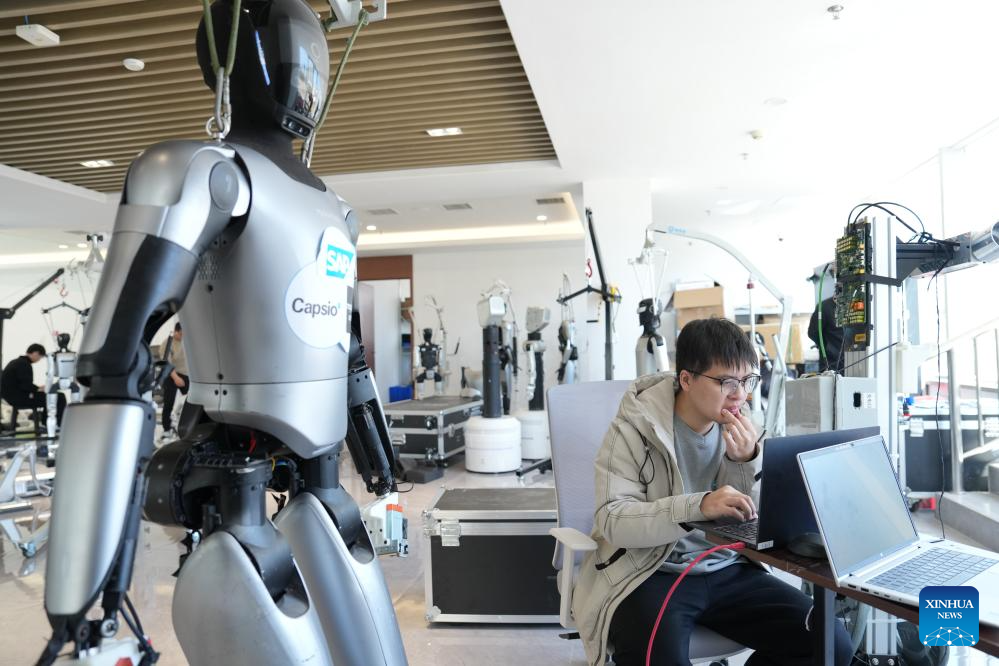 An employee tests a humanoid robot at MagicAtom in Suzhou, east China's Jiangsu Province, on March 10, 2026. (Xinhua/Li Bo)
