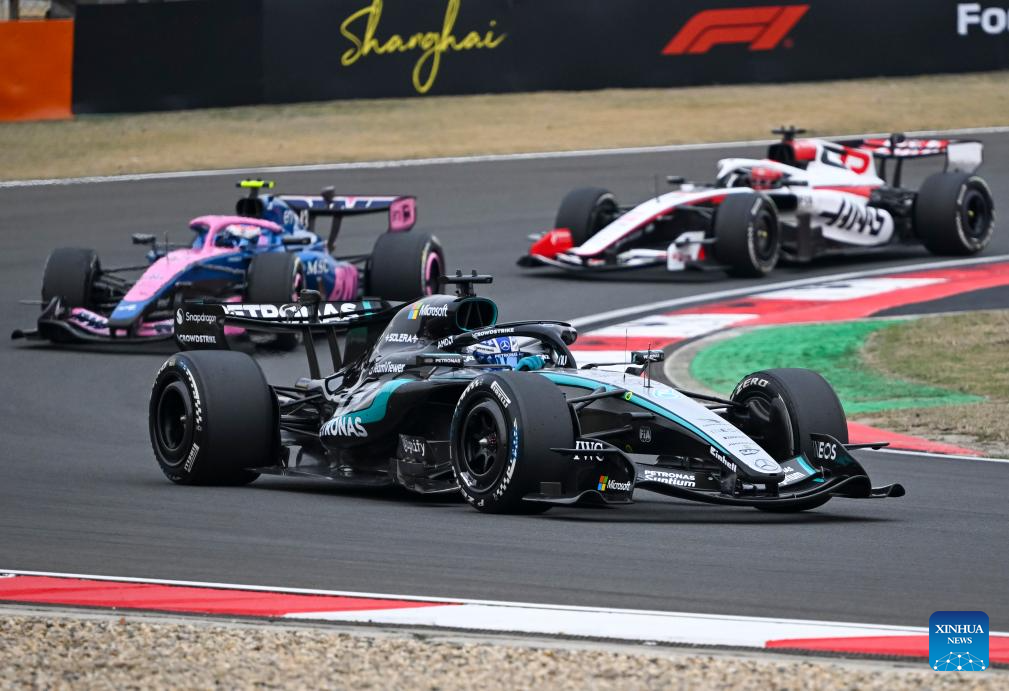 Mercedes' George Russell (front) of Britain competes during the Formula One Chinese Grand Prix at Shanghai International Circuit in Shanghai, China, March 15, 2026. (Xinhua/Chen Haoming)