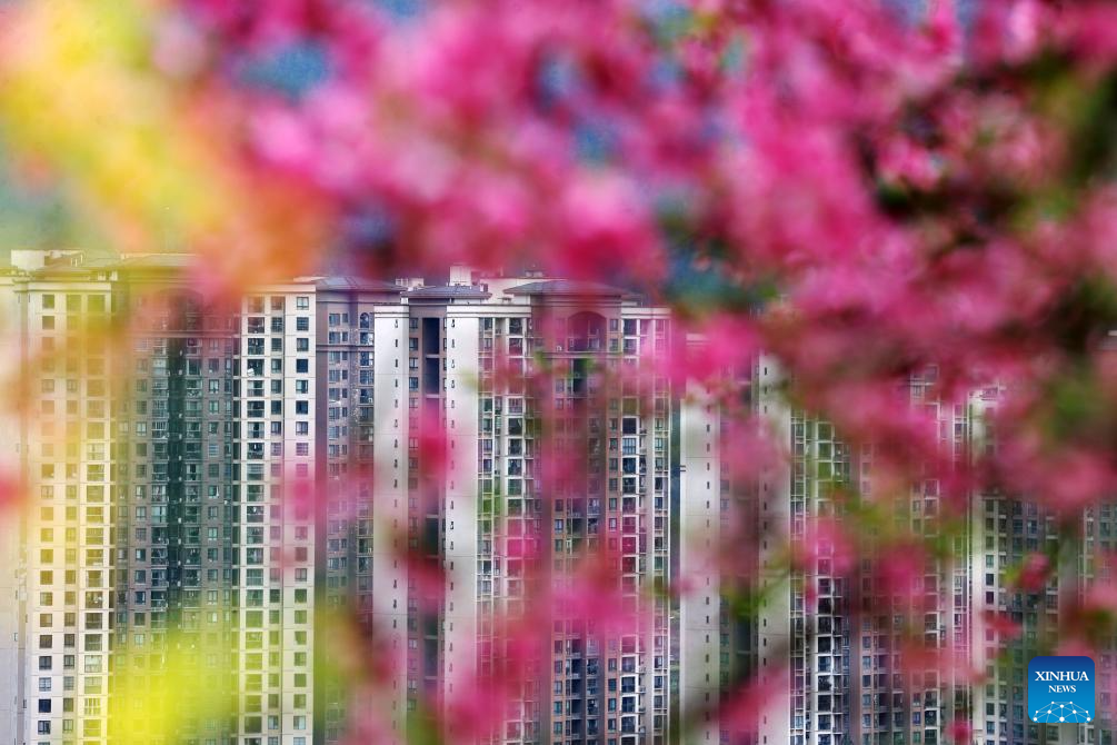 This photo taken on March 18, 2026 shows buildings behind peach flowers in southwest China's Chongqing. (Photo by Yang Min/Xinhua)