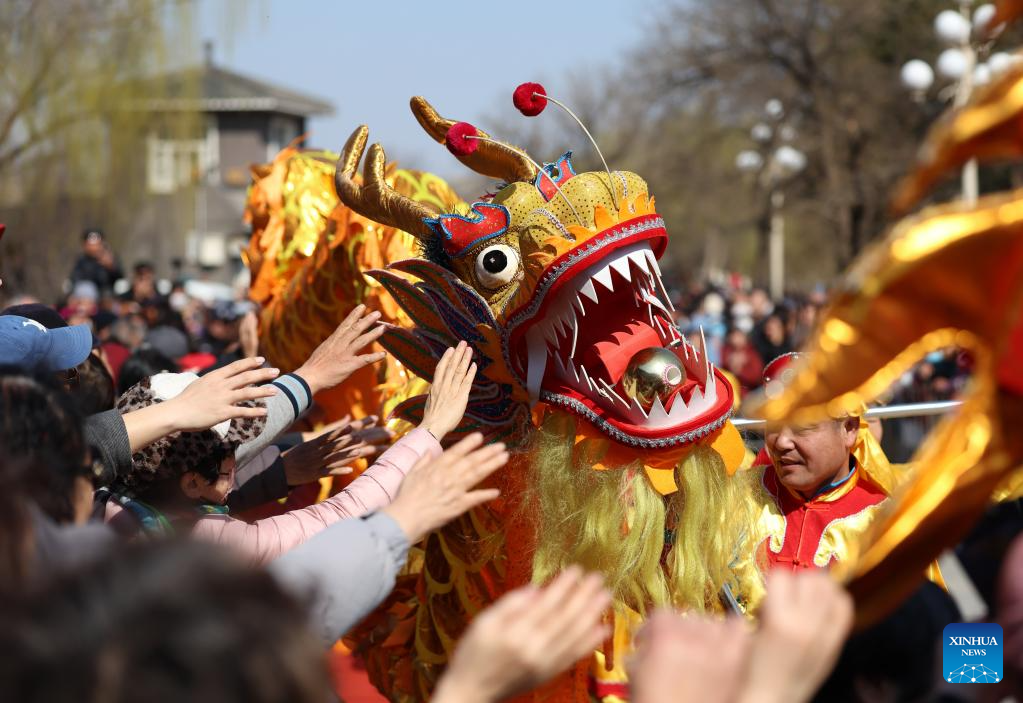 The audience interacts with dragon dance performers at a park in north China's Tianjin, on March 20, 2026. The spring equinox falls on March 20. This year, it also marks Longtaitou, also known as Dragon Head-raising Day, a significant occasion in the lunar calendar, celebrated by various activities across China. (Xinhua/Sun Fanyue)
